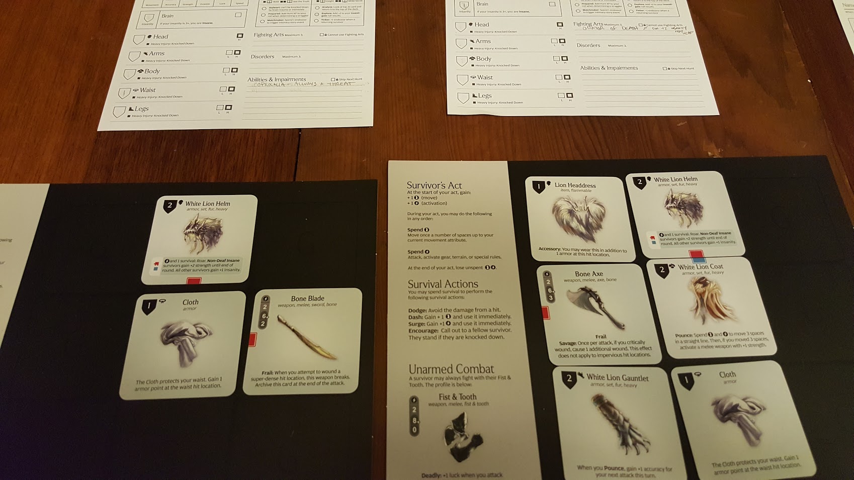 The Antelope draws the only AI card left to it… Back Kick. 3 damage to Cullen’s arms. He is knocked down and suffers Contracture, -1 accuracy and another bleeding token. The monster draws Back Kick again, determined to finish off its foe. The attack dismembers one of Cullen’s arms, gaining him his fifth and final bleeding token.