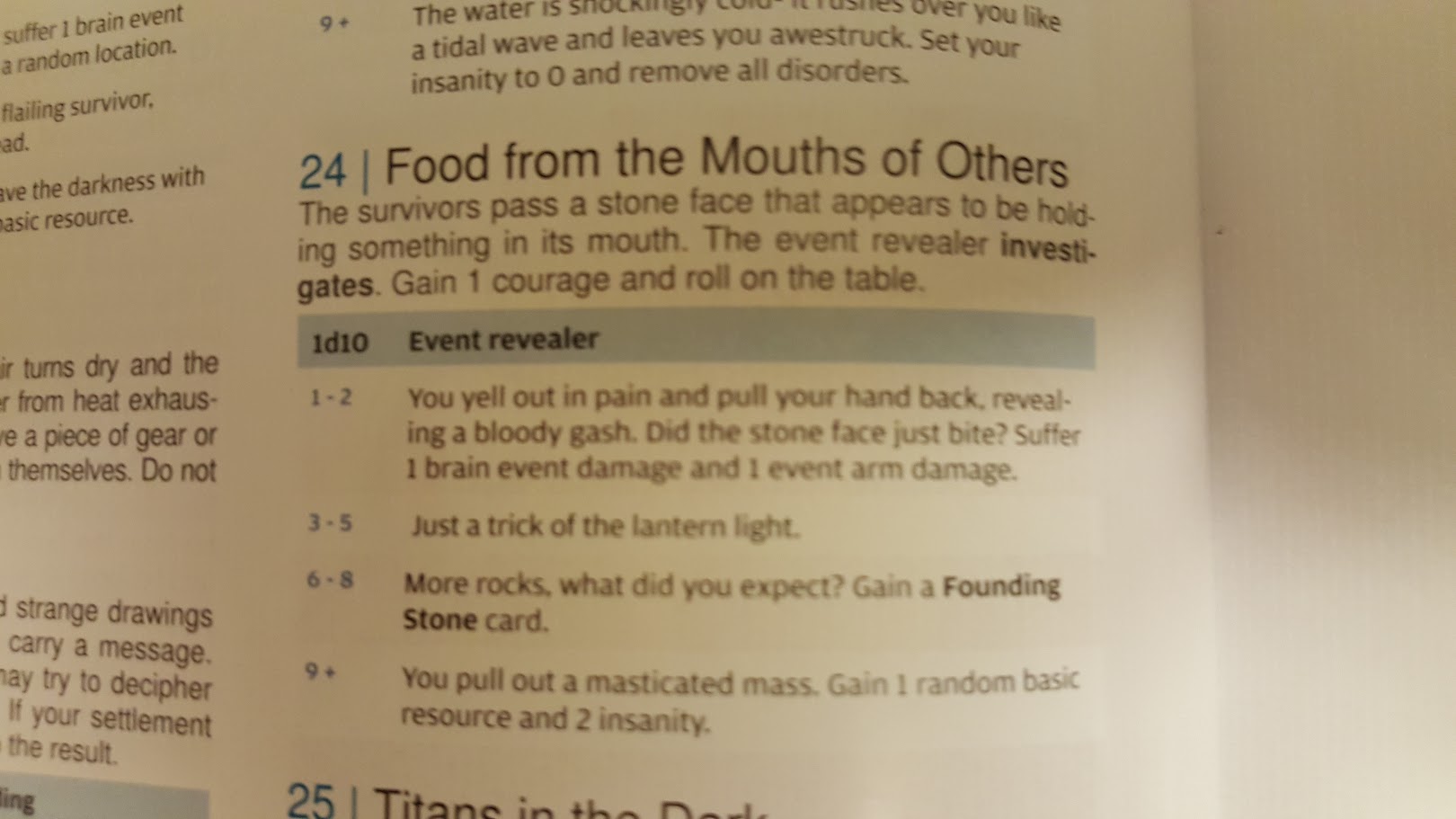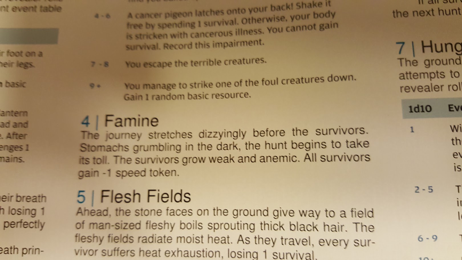 Ugh. The Antelope moves further away, meaning the party now has to endure more Hunt events to reach it, including passing over the Overwhelming Darkness space, a first for our civilization. They move to the second space, a regular hunt event, and roll a 24 on the Hunt Events table: Food from the Mouths of Others.