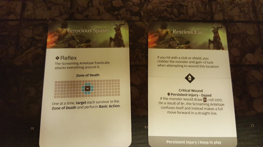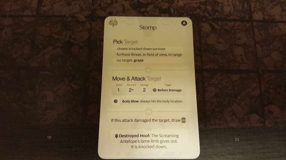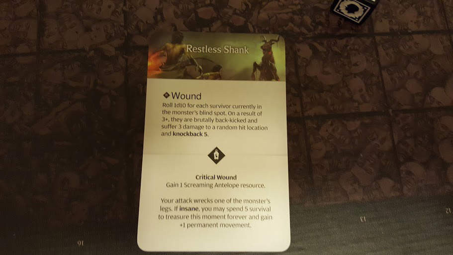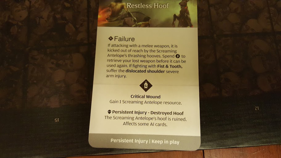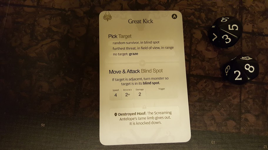 The Antelope Stomps and Snorts. Cullen is knocked down, and suffers brain trauma which gains him 3 insanity. As the hunter is knocked down, the Antelope goes again, drawing Back Kick. The severe damage to his body collapses Cullen’s lung. He gains a bleeding token, and -1 movement due to being unable to catch his breath. Defiant, Cullen stands up.