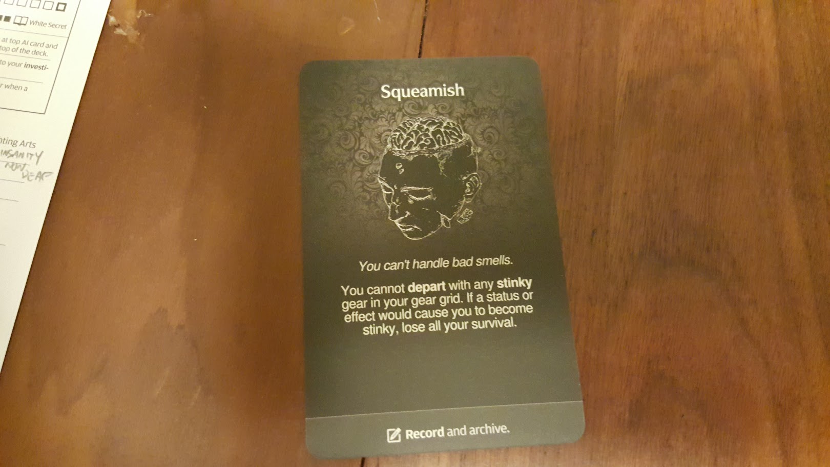 Jennissa investigates, and gains +1 courage. She rolls a 2, suffering 1 brain damage and 1 damage to her arms. Her courage gain triggers the Bold event.