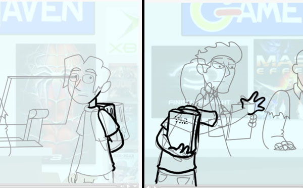 This is a huge benefit with the art, because these animators have to emulate an artstyle that I’ve been doing for over five years now. Seeing each scene in the rough stages allows me to catch things, and show them the way I would draw a particular pose or whatnot. Here’s an actual example of what some of those changes look like.