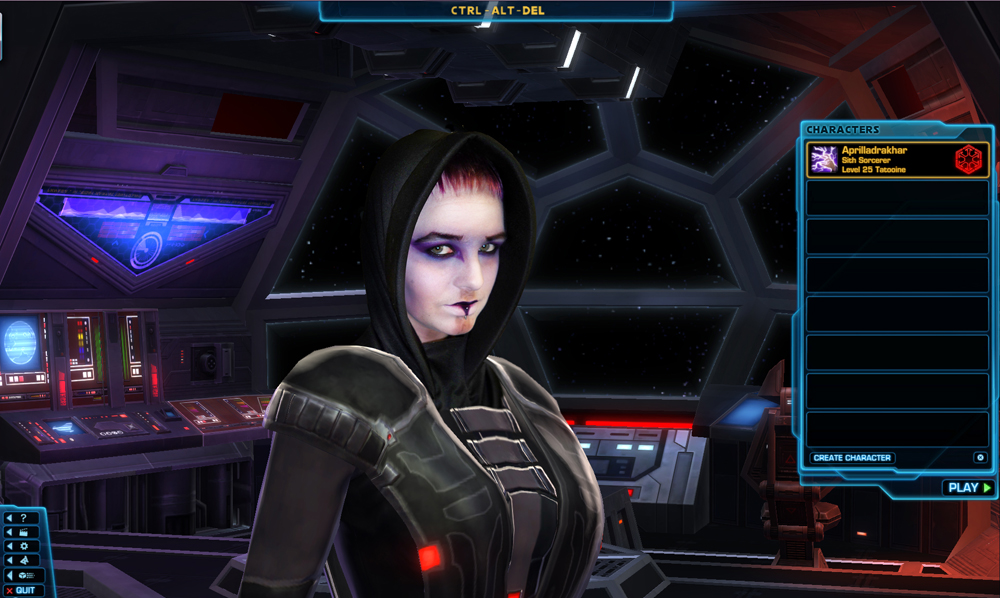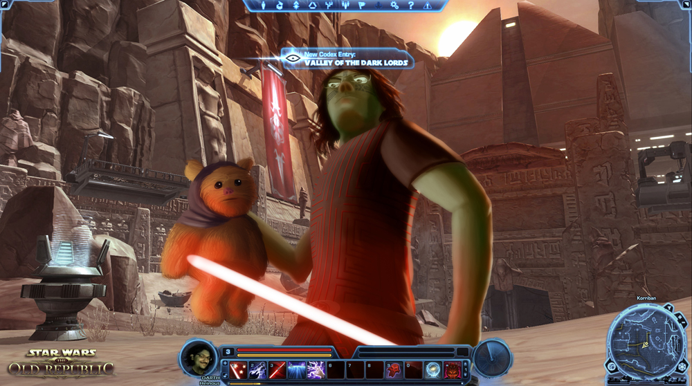 This one was really cool. Kaelee actually painted her face to match her Rattataki Sith Inquisitor (including the Imperial Alphabet scars that spell out her character name) and then superimposed the picture onto her actual character in-game. Definitely looks like she’s turned to the dark side to me!