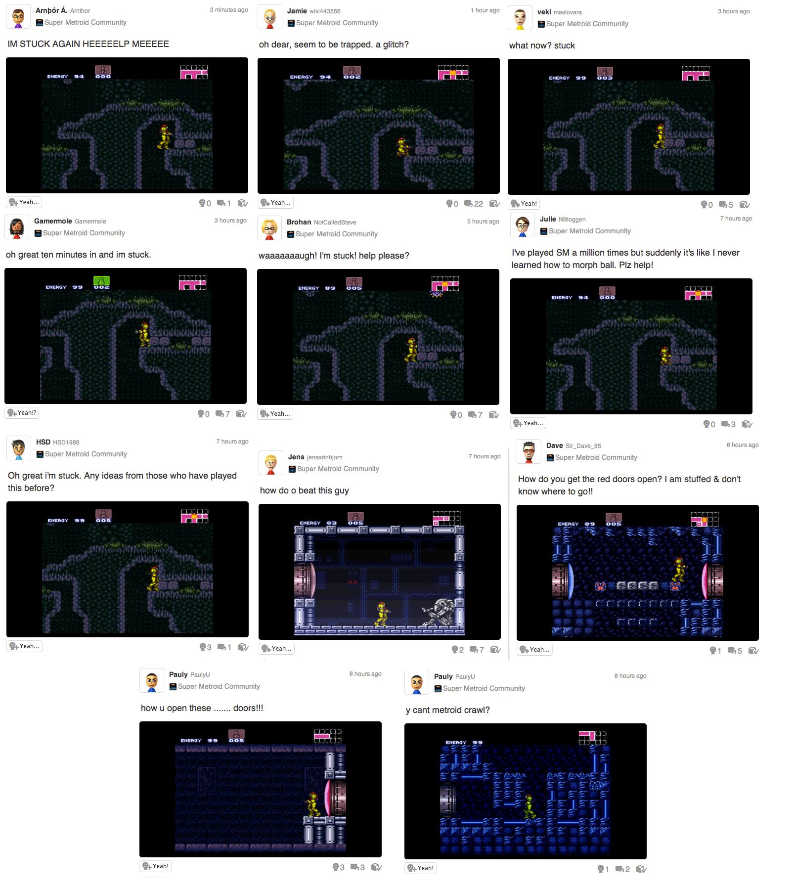 And there’s value in that too… it forced the development of some critical thinking and problem solving skills I’m sure. But again, the Miiverse is likely a small cross-section of people playing these classic Nintendo games, and the percentage of those getting stuck and asking to be walked through could very well be the same as gamers in the 90’s who bought strategy guides and called tip lines. It’s just far more visible now.